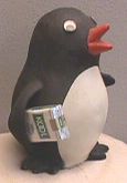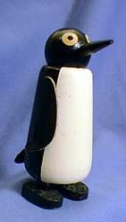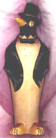 The best of these is the ceramic set, shown at left. [A better picture will appear just as soon as I put my hands on a pair of these slippery little devils.] These were obviously made in a conscious attempt to copy the KOOL penguins. "Willie" has a hat and cane. "Millie" is carrying a parasol. The pair shown at right may have been innocent impostors, but they still look enough like our guy to be worthy of mention.